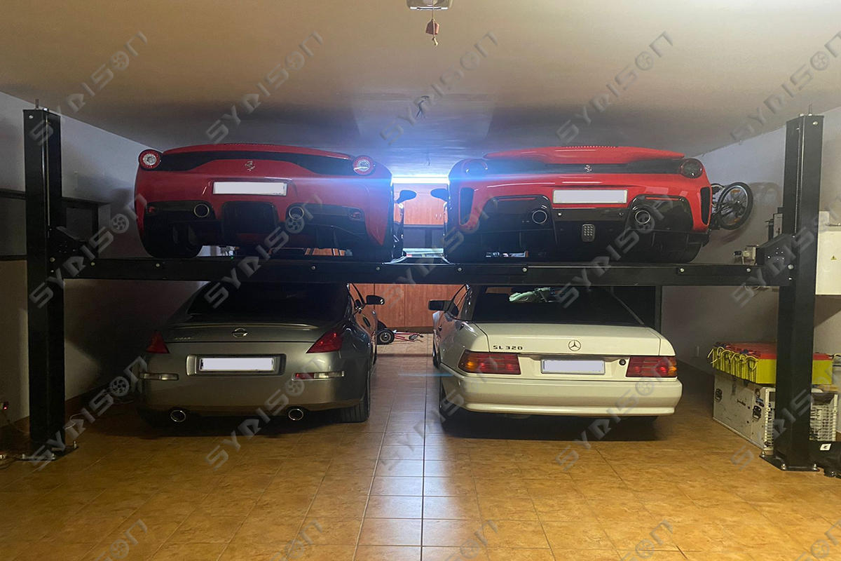 Two parking levels on each side allow four vehicles to be parked efficiently.